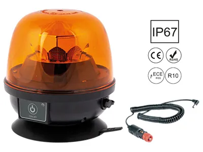 AUTOLINE LED blinkande varningsfyr med kraftfull magnetisk bas för snabb och säker montering på fordon. Denna gula varningsljus levereras med 10 kraftfulla LED-lampor och erbjuder totalt 11 olika ljusmönster - 7 blinkmönster, 4 roterande blinkeffekter samt fast ljus. Perfekt för bärgningsfordon, arbetsfordon och servicebilar. Det inbyggda uppladdningsbara batteriet ger upp till 8 timmars drift efter 4 timmars laddning, vilket garanterar långvarig användning. Fyren är godkänd enligt ECE R65 TA1 (vid kontinuerlig laddning) och R10, vilket säkerställer att den uppfyller alla säkerhetskrav. Kompakt design med diameter 130mm och höjd 140mm. IP67-klassad konstruktion ger utmärkt skydd mot väder och vind. Levereras komplett med cigarettändarekontakt, 12mm DIN-adapter och spiralkabel (max 3m). Fungerar på både 12V och 24V system, vilket gör den kompatibel med personbilar, lastbilar och tunga fordon. 12 månaders garanti ingår.