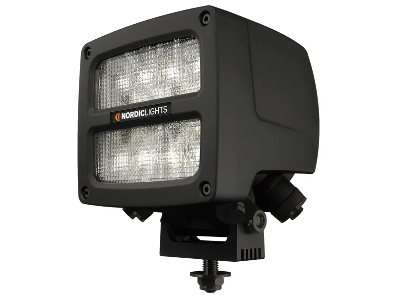 Nordic Lights Scorpius N4601 QD är ett extremt robust LED-arbetsljus utvecklat för tuffaste förhållanden. Med 11500 lumen ljusflöde (7200lm uppmätt enligt SAE) och Wide Flood-spridning ger denna lampa exceptionell arbetsbelysning för tunga fordon och maskiner. Aluminiumhuset tål stötar upp till 60G och vibrationsnivåer på 15.3Grms, vilket säkerställer pålitlighet i krävande miljöer. Quake-fästet är speciellt utvecklat för heavy duty anti-vibration montering. Lampan fungerar i temperaturer från -40°C till +85°C och tål saltspray enligt ISO 9227 240H. Den förstärkta polykarbonatlinsen skyddar mot stenskott och påkörningar. Integrerad 2-pin Deutsch DT-kontakt förenklar installation. Uppfyller SAE J1455, CISPR 25 Class 3 samt ISO 13766, 14982 och 7637-2. Perfekt för entreprenadmaskiner, skogsfordon, lastbilar och traktorer där extrema påfrestningar är vardagsmat. Vikt 2.5kg.